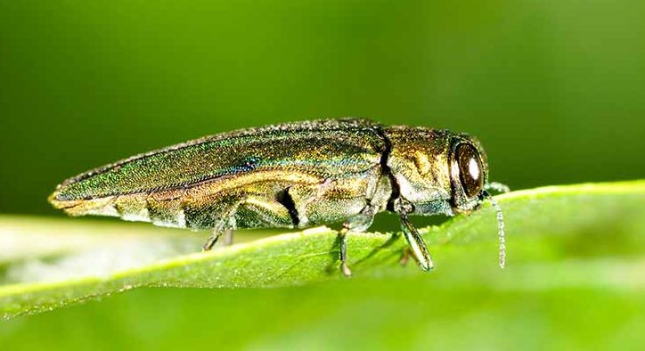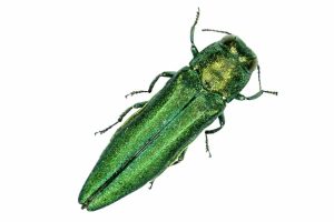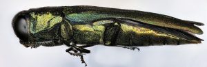 The Emerald Ash Borer (EAB) aka “The Green Menace” is a very small but very destructive beetle. Metallic green in color, its slender body measures 1/2-inch long and 1/8-inch wide. The average adult beetle can fit easily on a penny.